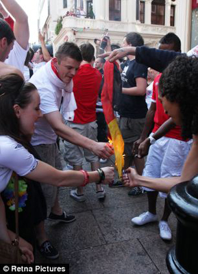 中新網6月28日電 據(jù)英國媒體報道,在英格蘭三獅軍團慘敗給德國新戰(zhàn)車后,一名德國隊支持者遭遇聚集在倫敦萊切斯特廣場觀戰(zhàn)的英格蘭球迷的圍堵。
