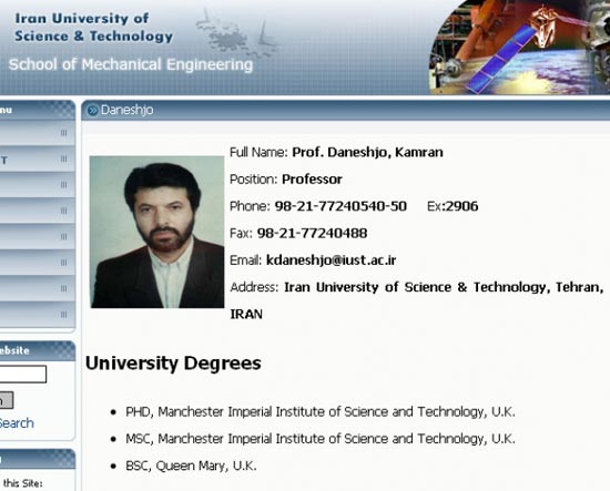 根據(jù)戴尼斯鳩的官方自傳,他曾在英國“倫敦學院”獲得航空和航天工程博士學位。問題是,英國根本就沒有這樣一所大學。Mowjcamp推測說,戴尼斯鳩的意思可能是指英國“帝國理工大學”,那所學校確實有航空學院。但戴尼斯鳩在德黑蘭工業(yè)科技大學網(wǎng)站上的簡歷卻與此不同,網(wǎng)上說,他在瑪莉皇后學院(倫敦大學的最大學院之一)獲得學士學位。