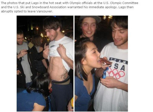 日前,一些關(guān)于拉戈在比賽后慶祝勝利盡情放松的照片在互聯(lián)網(wǎng)上流傳。從照片上看,拉戈與朋友們的慶祝方式極為不雅,他因此被斥為美國隊(duì)的恥辱。照片中,拉戈在溫哥華市內(nèi)的一處房屋內(nèi),身著美國隊(duì)訓(xùn)練服,佩戴著剛剛獲得的銅牌,而一名不知名的女子在他的腰部左右的位置親吻拉戈的獎牌。