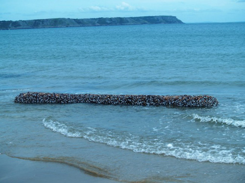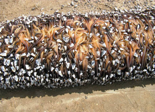 度假游客麗貝卡・波特以為自己看見了“一只活生生的大海怪”。她說:“它有兩米長,像電線桿子那么粗”,“事實上它們可能是我見過的最大型的飄浮的狗爪螺(又稱茗荷兒,鵝頸形藤壺)標(biāo)本”。經(jīng)專家驗證后,這個所謂的異星怪物原來是不計其數(shù)的狗爪螺。它們原本生活在海洋深處,受壞天氣影響從海里翻涌出來,并密密麻麻地附著在一塊木頭上隨波逐流,最終到達海灘,才成了這副模樣。
