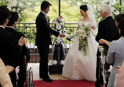這款高約1.5米的機(jī)器人身體主要是白色,頭戴花環(huán),還有兩根塑料辮子。“她”的眼睛可以閃爍,也可以用她細(xì)細(xì)的嗓音說(shuō)出“你可以揭開(kāi)新娘的面紗了”之類的話語(yǔ),主持起婚禮是有模有樣。