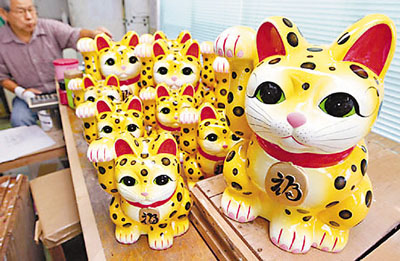 因日語中“豹”和“票”發(fā)音相同,原本“招財貓”的身體被圖上了豹子花紋!罢衅必垺泵恐欢加墒止ね可宵S色和黑色的顏料。據(jù)說制作這樣的一只至少需要4天,而上色一天只能完成20只。