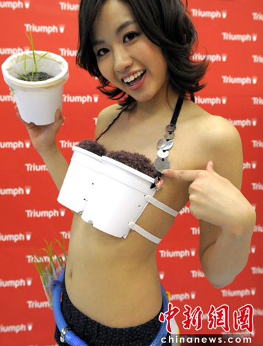 12日,日本東京,模特青山玲子正在展示日本黛安芬公司推出的一款新型內(nèi)衣。這種內(nèi)衣的罩杯是兩個“花盆”,可以種大米等農(nóng)作物。據(jù)悉,這款內(nèi)衣暫時不會在市場上發(fā)行、銷售。