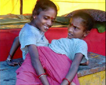 據(jù)香港大公網(wǎng)報(bào)道,這對(duì)連體姐妹靠在印度鄉(xiāng)村集市上展覽自己謀生養(yǎng)家,由于擔(dān)心接受分體手術(shù)后將失去“謀生資本”,所以她們從來(lái)都拒絕接受任何分體手術(shù)。令人驚訝萬(wàn)分的是,這對(duì)連體姐妹在二十二歲時(shí)還一起嫁給了同一個(gè)丈夫。