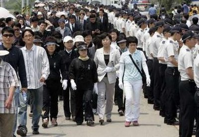 中新網(wǎng)5月26日電 韓國慶尚南道金海市峰下村25日的白天最高氣溫達到了30度,當天是韓國前總統(tǒng)盧武鉉逝世的第三天。從村子入口通往盧武鉉靈堂的兩公里長雙向2車道公路上,沒有一點兒背陰處。由于警方在村口阻止車輛進入,市民們只能頭頂報紙、手帕、草帽,在往返需要一小時的炎熱的柏油路上步行前往焚香所。很多人即使汗如雨下也沒有脫掉黑色的西服上衣。