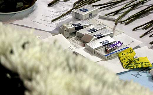 中新網(wǎng)5月26日電 韓國(guó)前總統(tǒng)盧武鉉23日跳崖自殺前,曾詢問(wèn)陪同登山的警護(hù)官“有沒(méi)有煙”。這一事實(shí)被報(bào)道之后,向盧武鉉靈前敬上一支煙成了一種“前所未有的吊唁儀式”。在韓國(guó)各地祭所的盧武鉉遺像前,很容易就能看到堆成小山的香煙。