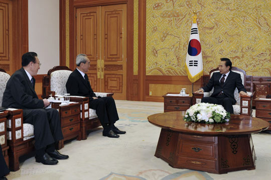 中新網(wǎng)8月23日電 綜合韓聯(lián)社等媒體報(bào)道,韓國總統(tǒng)李明博23日上午在青瓦臺接見了前來吊唁韓國前總統(tǒng)金大中的朝鮮吊唁團(tuán)。
