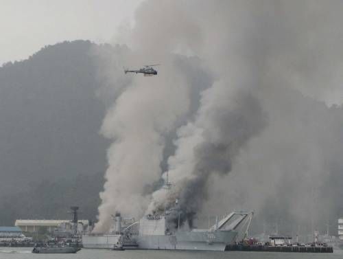 《星洲日?qǐng)?bào)》報(bào)道,該軍艦從早上6時(shí)25分開始燃燒,直到下午3時(shí)許火勢才被控制下來。