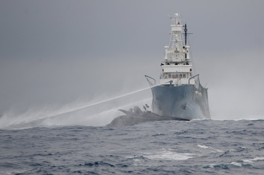 負(fù)責(zé)捕鯨任務(wù)的日本鯨類(lèi)研究所指責(zé)“海上牧者”試圖以快艇高速接近、拋擲繩索的方式絞住捕鯨船的推進(jìn)器。