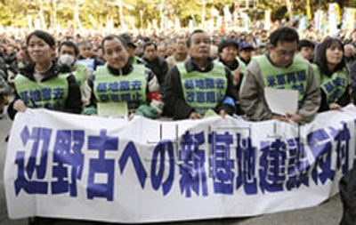 現(xiàn)行計劃中的搬遷地點、沖繩縣名護(hù)市新當(dāng)選的市長稻嶺進(jìn)也向集會發(fā)來了表達(dá)共同愿望的信息。市民團(tuán)體“直升機(jī)基地反對協(xié)議會”的共同代表安次富浩表示:“鳩山由紀(jì)夫首相說將把名護(hù)市長選舉的結(jié)果作為判斷材料,我們?nèi)〉昧藙倮]有比這更能代表民意的了!