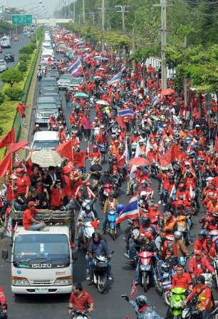 第一波示威活動(dòng)于12日傍晚結(jié)束。紅衫軍13日將重新集結(jié),前往皇家田廣場(chǎng)等主要集會(huì)場(chǎng)所,附近是熱門旅游景點(diǎn)大皇宮及玉佛寺。東北部和北部各省的上萬紅衫軍支持者昨天也開始向曼谷出發(fā),將于周日抵達(dá)。