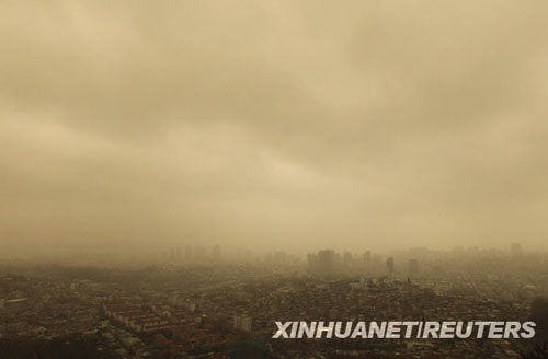 中新網(wǎng)3月22日電 據(jù)韓國(guó)《朝鮮日?qǐng)?bào)》報(bào)道,上周末,韓國(guó)全境遭到史無前例的最厲害的“超級(jí)沙塵”襲擊。這場(chǎng)沙塵暴20日下午來襲,持續(xù)到21日凌晨,韓國(guó)全境被黃黃的沙塵吞沒。