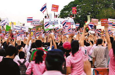 這批“粉衫軍”包括來(lái)自曼谷朱拉隆功大學(xué)的師生、旅游業(yè)者和“和平網(wǎng)絡(luò)”組織的成員,有人稱他們?yōu)椤胺奂t運(yùn)動(dòng)”。在前副警察總長(zhǎng)瓦西和朱拉隆功大學(xué)政治科學(xué)系主任乍叻帶領(lǐng)下,他們昨日在倫披尼公園內(nèi)的拉瑪四世像前宣誓,矢言保護(hù)國(guó)家,同時(shí)聯(lián)署請(qǐng)?jiān)感,反?duì)解散國(guó)會(huì)和修改憲法,指此舉不符合國(guó)家最佳利益。