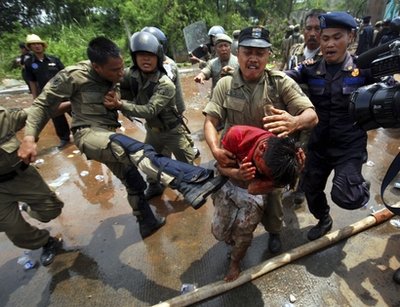 沖突發(fā)生在首都雅加達(dá)北部的丹戎不碌,該市發(fā)言人庫(kù)爾尼亞(Cucu Kurnia)稱(chēng),約2000名安保人員與600名警察用催淚彈、橡皮子彈、高壓水槍與警棍驅(qū)散示威民眾,。警方估計(jì)示威民眾約有500人。