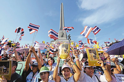 黃衫軍示威者聚集在曼谷英雄紀(jì)念碑,揮國(guó)旗及泰王海報(bào)。