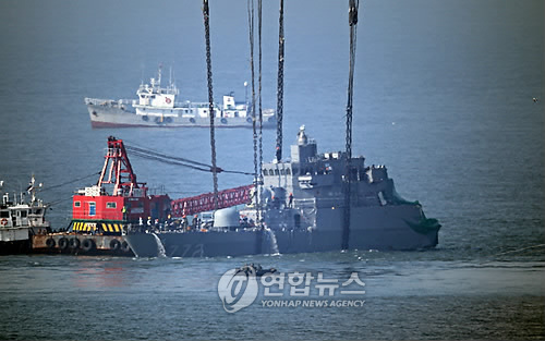 中新網4月24日電 據(jù)韓聯(lián)社報道,韓國海軍“天安艦”艦首24日被吊出水面之后,呈現(xiàn)了沉沒之前受到強力沖擊的痕跡。