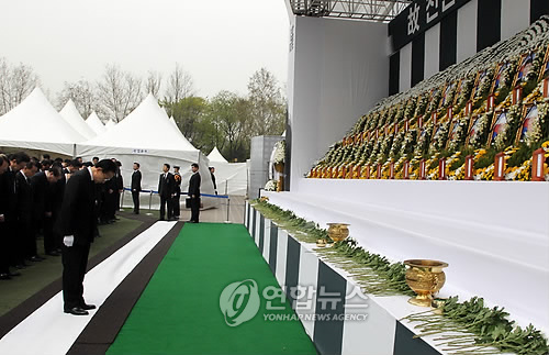 李明博向犧牲官兵獻(xiàn)花燒香后,以悲痛的表情默哀,之后面對(duì)一個(gè)個(gè)犧牲官兵的遺照審視了良久。