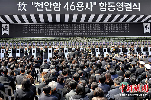 中新網(wǎng)4月29日電 據(jù)韓聯(lián)社報道,在爆炸沉沒事件中遇難的韓國警戒艦天安艦46名官兵的遺體告別儀式29日上午在韓國海軍平澤第二艦隊司令部內(nèi)安保公園舉行。