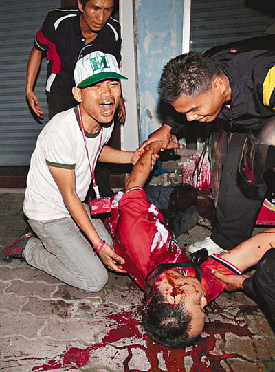 納塔武對(duì)記者說(shuō):“阿披實(shí)已為內(nèi)戰(zhàn)揭開(kāi)序幕了。我們緊急要求政府撤軍,停止一切暴力行為。如果阿披實(shí)不同意停火,我不知道我們能否活過(guò)今晚。我們希望阿披實(shí)不想要戰(zhàn)爭(zhēng)。”