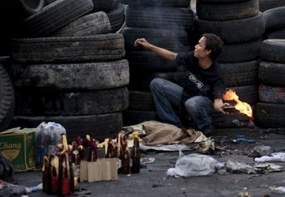 有“紅衫軍”成員將一輛油罐車駛至一個(gè)主要路口,并燃燒輪胎企圖引爆。目擊者說,除了商場(chǎng)和酒店林立的商業(yè)區(qū)外,市內(nèi)另一處地區(qū)也發(fā)生流血事件。有三幢商業(yè)大廈著火焚燒。當(dāng)局周一開始局部封鎖市內(nèi)著名游客區(qū)蘇坤蔚路。