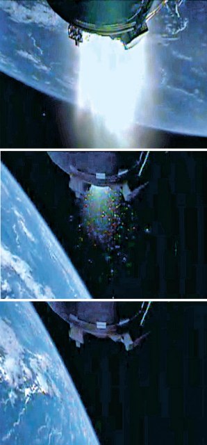 韓國方面公布的這三張照片,分別是兩段火箭的引擎正常點(diǎn)火發(fā)動(dòng)的照片(上)、兩段火箭的燃素即將熄滅時(shí)的照片(中)和航天器因火箭上段未能正常分離的整流罩而偏離軌道的照片(下)。