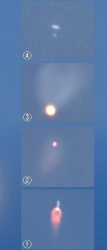 韓國(guó)最大的國(guó)營(yíng)電視臺(tái)KBS拍到的畫面顯示:①圖升至距地面70公里高空的“羅老”號(hào)的火焰開始是紅色的,②圖接著火焰變大,呈現(xiàn)類似爆炸后的景象,③火焰越變?cè)酱,并向下掉落。④火焰消失后,被推測(cè)認(rèn)為是“羅老”號(hào)的白色物體開始向下墜落。
