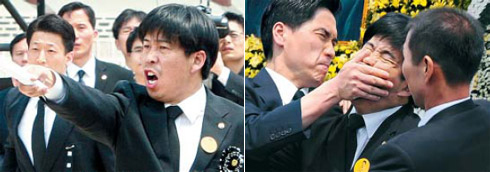 韓國(guó)去年5月29日為盧武鉉舉行葬禮。遺體告別儀式上,當(dāng)李明博起身準(zhǔn)備向盧武鉉遺像獻(xiàn)花時(shí),白元宇突然朝他大喊“你是政治殺人犯”“請(qǐng)李總統(tǒng)道歉”。