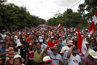 中新網(wǎng)7月6日電 據(jù)法新社等媒體報(bào)道,洪都拉斯被逐總統(tǒng)塞拉亞的專機(jī)當(dāng)?shù)貢r(shí)間5日無(wú)法在洪都拉斯首都的機(jī)場(chǎng)降落,只得在尼加拉瓜首都機(jī)場(chǎng)降落。而3萬(wàn)民眾在洪都拉斯的機(jī)場(chǎng)附近示威游行。示威者和警方發(fā)生了沖突,目前造成2人死亡,2人受傷。
