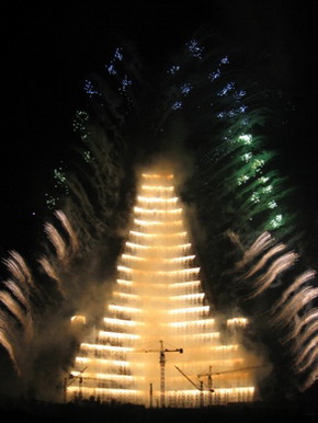 看點(diǎn)二是“強(qiáng)盛大國(guó)的火花”、“我們將勝利”兩場(chǎng)煙火晚會(huì)。4月14日晚,一場(chǎng)旨在紀(jì)念金日成主席誕辰97周年、宣誓邁向強(qiáng)盛國(guó)家的煙火表演照亮了平壤的夜空。隨著聲聲炮響,五顏六色、造型各異的美麗煙火依次騰空,把大同江上下游兩座橋之間的區(qū)域變成了煙火的海洋。朝鮮最高領(lǐng)導(dǎo)人金正日同志的出場(chǎng)令全場(chǎng)氣氛格外高漲,掌聲和歡呼聲回蕩在大同江的兩岸。有意思的是,13日、15日平壤下了兩場(chǎng)春雨,唯獨(dú)14日萬里晴好,給煙火表演留下了完美的時(shí)間窗口。5月1日在柳京大廈舉行的焰火晚會(huì)更具特色,巨大的樓體第一次流光溢彩,散發(fā)出美麗的火光,那神奇的景象讓人難忘。