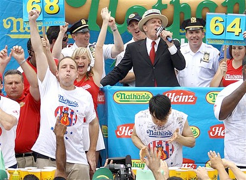 他的主要挑戰(zhàn)對手,曾經(jīng)六次奪冠的綽號為“海嘯”的日本男子小林尊在同一時(shí)間里吃掉64個(gè)半熱狗。