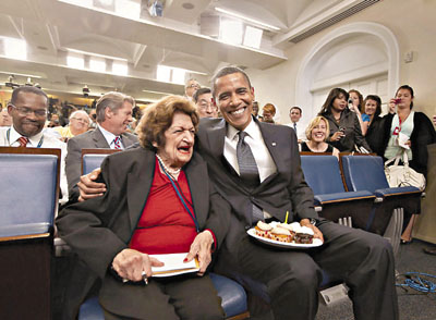 8月4日是奧巴馬48歲生日,也是赫斯特報系專欄作家湯馬斯的89歲生日。白宮首席發(fā)言人吉布斯在白宮新聞發(fā)布室內(nèi)進行每日簡報,大批記者聚集向他提問,此時,奧巴馬捧杯形蛋糕入內(nèi),帶領(lǐng)記者團為湯馬斯唱生日歌。