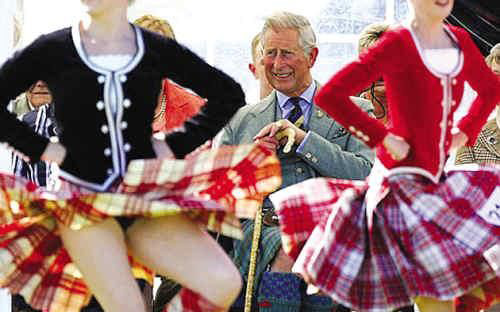 報道稱,日前查爾斯首次在妻子卡米拉陪同下,到蘇格蘭北部高地出席貴族競技賽;顒由希信璧秆輪T起舞助興,舞動時揚起了蘇格蘭裙露出黑色內(nèi)褲和美腿,查爾斯看見后,一邊微笑一邊緊盯。