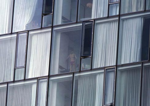 在美國(guó)紐約市新近開放的High Line公園內(nèi),矗立著Standard Hotel酒店, 該酒店房間面朝公園的一面被建造為落地玻璃窗,方便房客俯瞰公園景色,當(dāng)然,酒店外的人也能透過玻璃窗清楚地看到房間里的景象。然而,許多房客不知出于什么原因,經(jīng)常沒有拉上窗簾,就進(jìn)行各種私人活動(dòng),將一些裸露、猥褻、甚至粗野的行為都完整地暴露在公眾的視線當(dāng)中,讓公園游客們大飽眼福。
