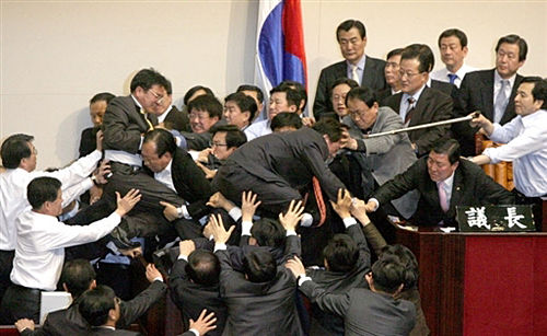 韓國國會議員2007年12月14日因一項彈劾檢察官的提案而發(fā)生大規(guī)模群毆,這些檢察官為呼聲最高的總統(tǒng)候選人李明博清除了詐欺罪嫌。據(jù)“中央社”報道,在大約100名在野黨籍議員以桌椅阻擋國會主要議事廳的出入口后,一群親政府的議員被迫穿越圍欄以設(shè)法進入議事廳。 chinanews發(fā) 攝