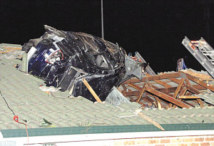 19日凌晨,尚在睡夢中的阿諾德夫婦突然被一聲巨響驚醒,他們感到自己家的平房似乎在震動,于是立即抱著僅有3個月大的女兒沖出了室外。他們被眼前的一幕驚呆了:一輛汽車砸爛了他們家的屋頂,而且一半車身已經陷了進去。如果汽車掉進他們家臥室的話,后果將不堪設想。