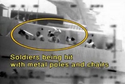 以軍發(fā)布長(zhǎng)1分鐘的紅外線錄影片段,并配上英文字幕上載至YouTube網(wǎng)站。片段可見,當(dāng)首名士兵從直升機(jī)游繩而下,甫踏足土耳其救援船“馬維.馬爾馬拉號(hào)”甲板之際,一名船員便向他投擲閃光彈,甲板上的人紛找掩護(hù)或伏在地上。這時(shí)候,有船員抓住以軍的繩子搖晃,一名士兵似脫手掉下。他們又把繩子縛在甲板,企圖扯下直升機(jī)。降落甲板計(jì)程車兵遭佩戴防毒面具的船員攻擊。字幕稱:“士兵遭人以金屬棒和椅子毆打!贝瑔T又企圖搶奪士兵的武器,一名士兵更被多名船員合力抓住雙腿,從甲板拋下。