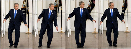 中新網(wǎng)3月7日電 美國共和黨總統(tǒng)參選人麥凱恩5日鐵定取得黨內(nèi)提名,氣勢逼人,約了總統(tǒng)布什吃午餐,作為布什正式宣布支持他的前奏,但竟然大牌到要布什在白宮門前久等。布什為打發(fā)時(shí)間,竟在一眾記者面前跳起踢跶舞(見圖),滿堂發(fā)笑。