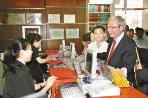 “澳大利亞總理喜歡有關(guān)中國傳統(tǒng)文化的圖書”,記者近日從北京發(fā)行集團(tuán)獲悉,8月8日上午,前來北京參加第29屆奧運(yùn)會開幕式的澳大利亞總理陸克文在澳大利亞駐華大使芮捷銳博士的陪同下走進(jìn)王府井書店選購圖書。