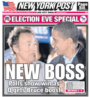 據(jù)美國《紐約郵報》3日報道,美國當(dāng)?shù)貢r間11月2日,奧巴馬一家在俄亥俄州克利夫蘭的競選集會上與著名美國搖滾歌手布魯斯斯普林斯廷同臺獻(xiàn)藝。新一輪民調(diào)顯示,離大選還有最后一天,奧巴馬已經(jīng)贏了。該報封面用“新老板”來稱呼勝利在望的奧巴馬。該報稱:斯普林斯廷用歌聲表達(dá)了對奧巴馬的贊揚。據(jù)悉,1984年大選中,獲勝的里根曾引用斯普林斯廷的歌詞以爭取年輕人的選票。