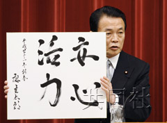 麻生在記者會上展示自己的書法杰作。他說:“我下定決心面對此時的困難時局,對人民的期望作出反應(yīng)。我要保護人民的生計。財政預(yù)算案是最重要的經(jīng)濟政策!