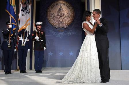 奧巴馬的裝束為燕尾服配領(lǐng)結(jié),第一夫人米歇爾(Michelle)則身穿出自設(shè)計師吳季剛(Jason Wu)之手的露肩晚禮服,禮服帶有長長的裙擺。兩人在參加完當天的儀式和慶典后就一直穿梭忙碌于各種社交活動。