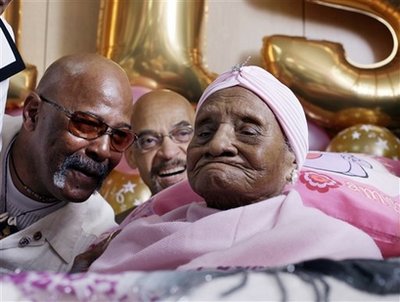 由于居住在葡萄牙的女人瑞在去年過(guò)世,貝恩斯由今年1月成為全球最老的人瑞,經(jīng)過(guò)吉尼斯世界紀(jì)錄委員會(huì)的認(rèn)證。她在美國(guó)大選中投下奧巴馬一票,成為最年長(zhǎng)黑人選民,見證歷史,全國(guó)知名。但她現(xiàn)在住在醫(yī)院里,平常還喝一點(diǎn)酒。