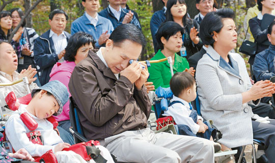 當聽到連發(fā)音都不甚標準的殘疾人兒童認真的歌唱,金潤玉女士馬上流下了眼淚,李明博總統(tǒng)最后也忍不住落下了淚水。