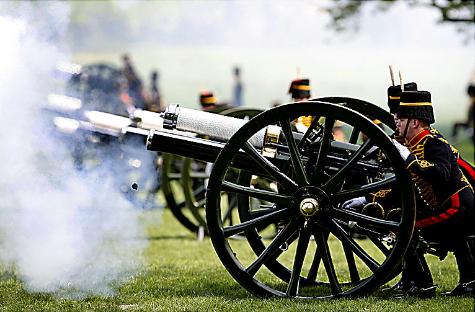 為慶祝英國女王伊麗莎白二世83歲的生日,英國皇家騎兵炮兵連在倫敦海德公園鳴放41響禮炮,來為女王慶生。這一天女王和丈夫菲利普親王待在溫莎城堡,沒有公開的行程。