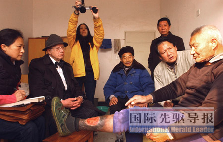 78歲的盛益銀小心翼翼地挽起褲腳,露出結了痂的右腿。坐在一旁的邁克爾•弗蘭茨布勞俯下身摸了摸,然后從發(fā)病的時間、癥狀到如何得到救治一一詢問起來。