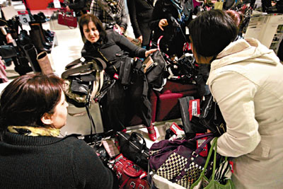 在伯明翰一購物中心,3位顧客在爭奪減價(jià)名牌手袋。