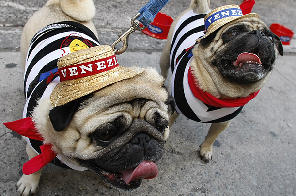 圖片七:哈巴狗馬克思和哈勃身穿橫條背心,脖系紅領帶,頭戴草帽,打扮成稱威尼斯鳳尾船船夫的模樣。(鐘巖)