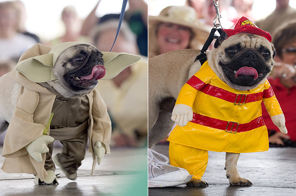 圖片十五:在弗洛里達(dá)州布蘭登通的年度哈巴狗大賽上,左圖中的“時尚人士”尤達(dá)正與右圖中的“消防員”爭奪第一名。(鐘巖)