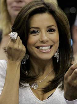 “絕望主婦”伊娃·朗格莉亞日前助陣丈夫托尼·帕克所屬馬刺隊和開拓者隊的NBA常規(guī)賽。場邊的她除了為老公充當拉拉隊外,還不時拿起托尼碩大的2007NBA總冠軍指環(huán),朝著媒體鏡頭得意地大秀一番。