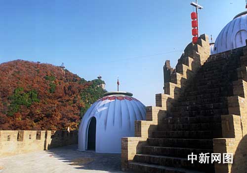 傍晚時(shí)分,一串串號(hào)燈彤紅高懸,帥旗、戰(zhàn)旗、旌旗獵獵。偶爾傳來(lái)幾聲戰(zhàn)馬嘶鳴和幾聲清脆的巡營(yíng)梆鼓。龍頭寺吊橋門(mén),一夫當(dāng)關(guān),萬(wàn)夫莫開(kāi),李世民的千軍萬(wàn)馬當(dāng)年均由此入營(yíng),森嚴(yán)壁壘,固若金湯。唐營(yíng)觀(guān)夕照:當(dāng)日落西山時(shí),一輪紅日紅艷欲滴,舉手可攬。在此拍照留影,如雙手捧日。落日的余暉里,火燒云天邊斜掛,蒼山如海,殘陽(yáng)如血,真是神靈造化,天下奇觀(guān)。